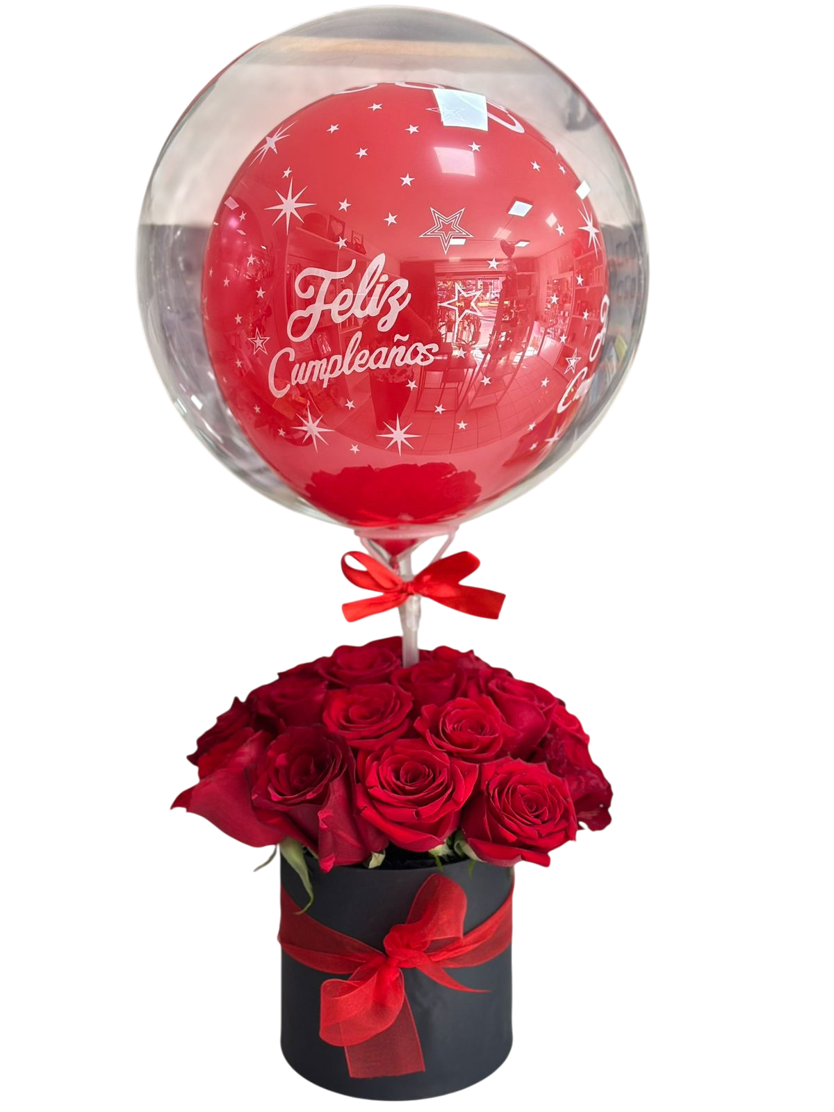 Hermoso arreglo de rosas rojas en caja acompañado de globo “Feliz Cumpleaños”, ideal para celebrar y sorprender en una fecha especial.