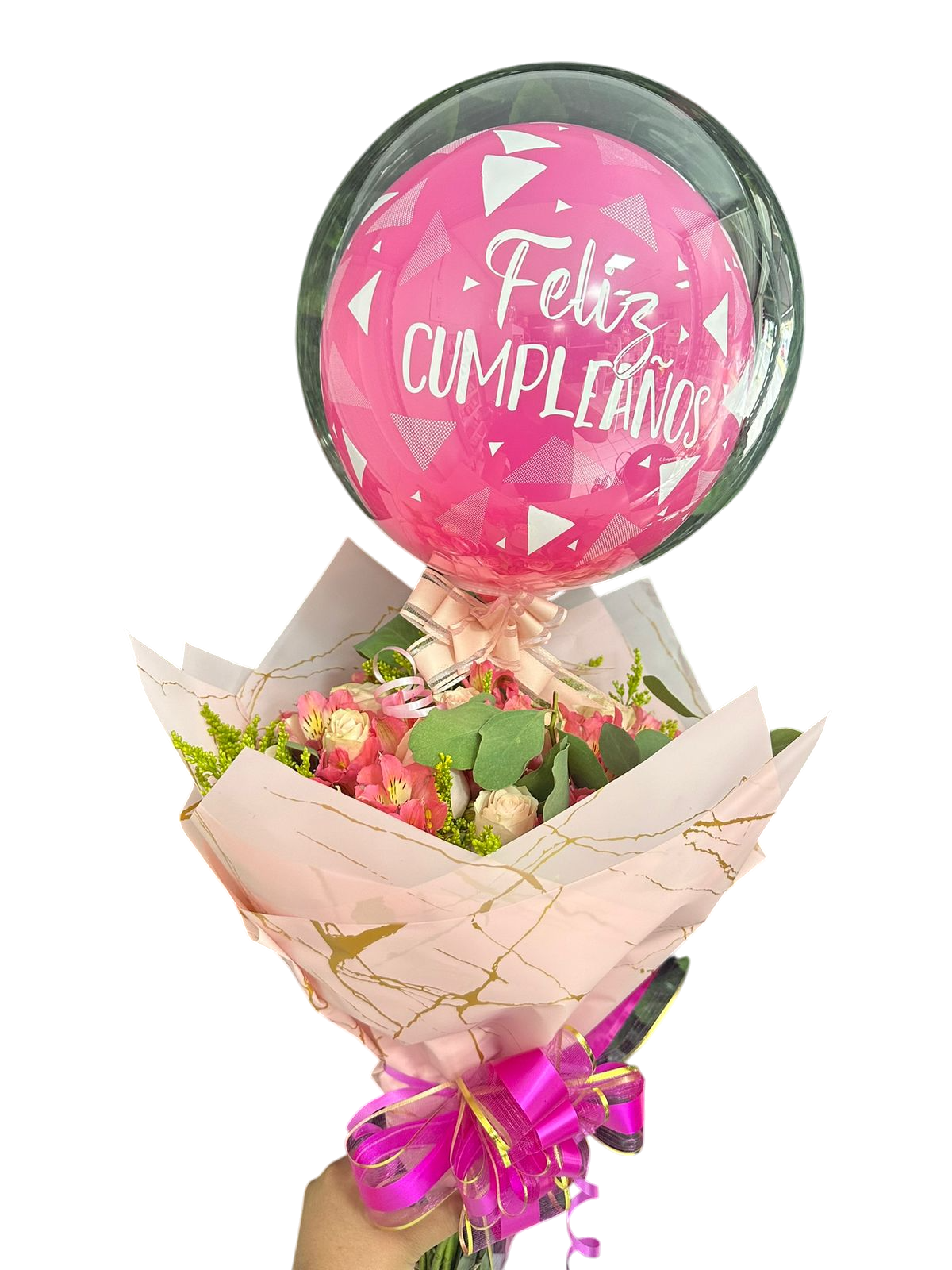 Alegre ramo de flores en colores variados acompañado de globo “Feliz Cumpleaños”, ideal para celebrar y sorprender en una fecha especial.