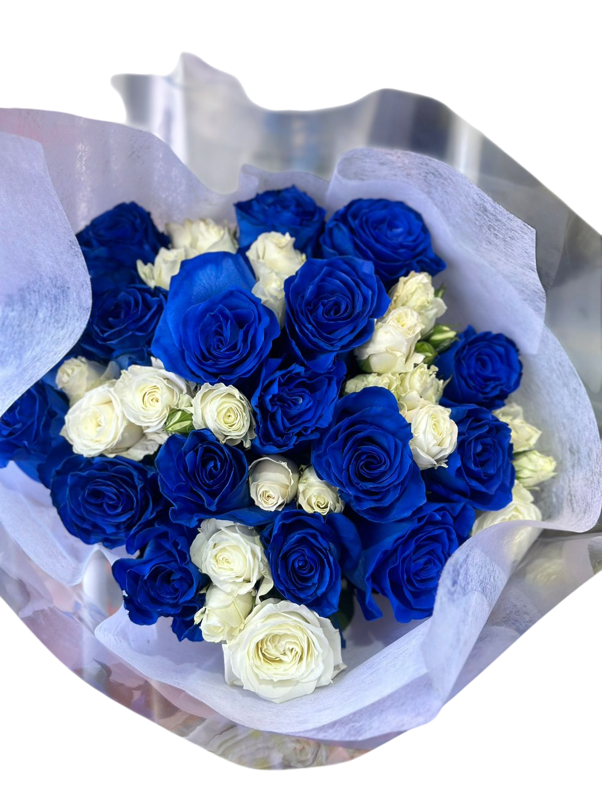 Sofisticado ramo de rosas azules y blancas, ideal para expresar elegancia, tranquilidad y sentimientos especiales.