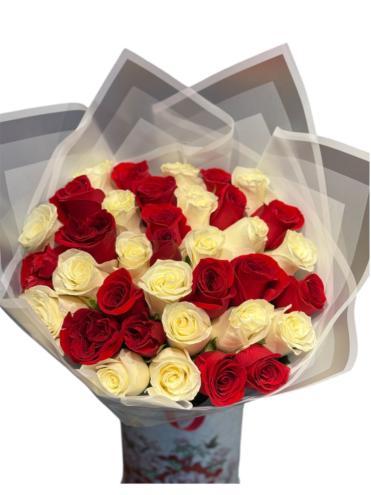 Elegante ramo de rosas blancas y rojas, una combinación perfecta de pureza y amor para cualquier ocasión especial.
