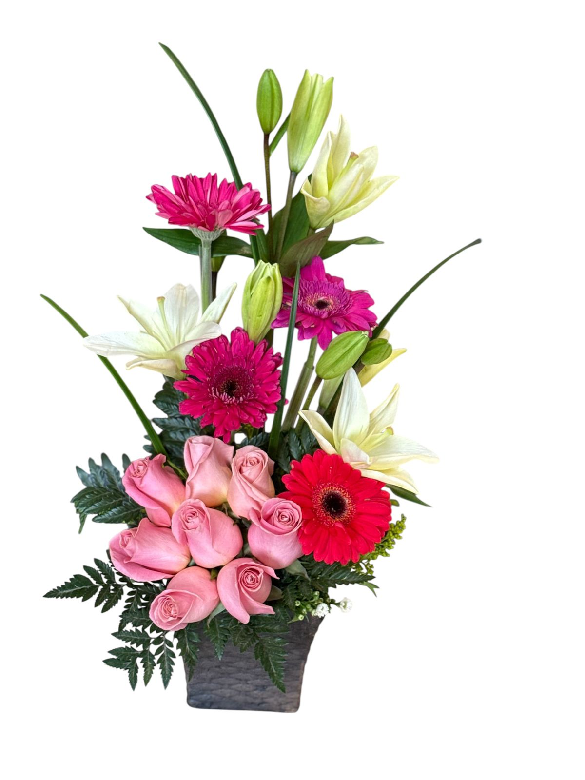 Hermoso arreglo con gerberas, lirios y rosas, elaborado según disponibilidad de colores, ideal para sorprender y expresar amor este San Valentín.