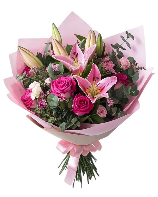 Hermoso ramo de rosas con lirios, elaborado según la disponibilidad de color, ideal para sorprender y expresar amor este San Valentín.