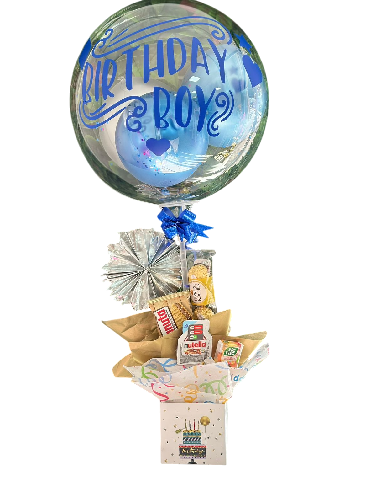 Divertido globo personalizado relleno con dulces variados, que incluyen Ferrero, Hanuta, Tic Tac y Nutella. Un detalle original y dulce para sorprender en cualquier ocasión.